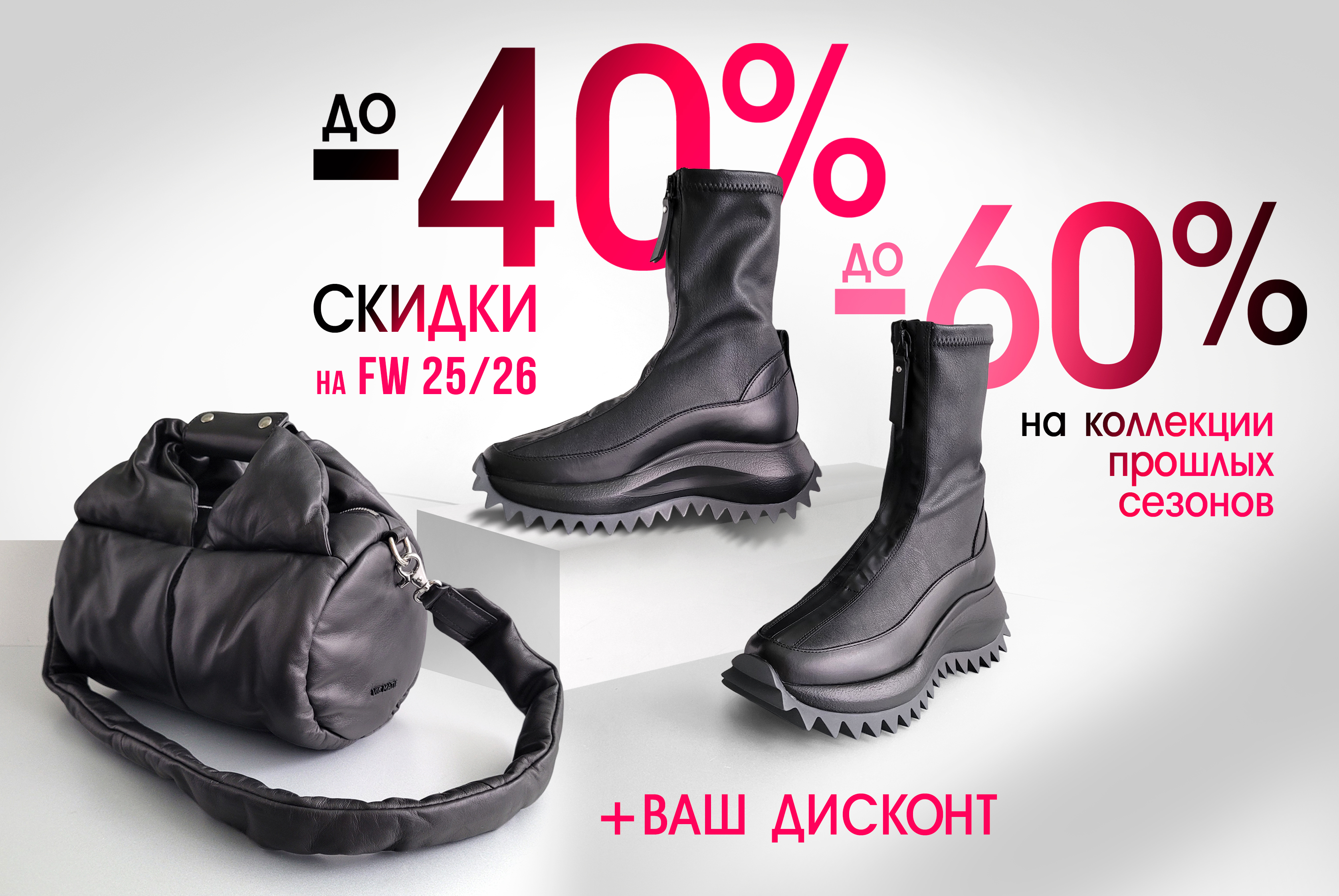 - В салонах «ЭЛЕГАНТ» СКИДКА до 40% + Ваш дисконт на FW25/26!* ** На коллекции прошлых сезонов скидка до 60% +Ваш дисконт!* *На последние пары доп. скидка 20% ко всем скидкам. Дисконт не действует. **На кроссовки бренда PREMIATA FW25/26 скидка 20% от первой цены. Дисконт не действует. Мы рады видеть Вас!